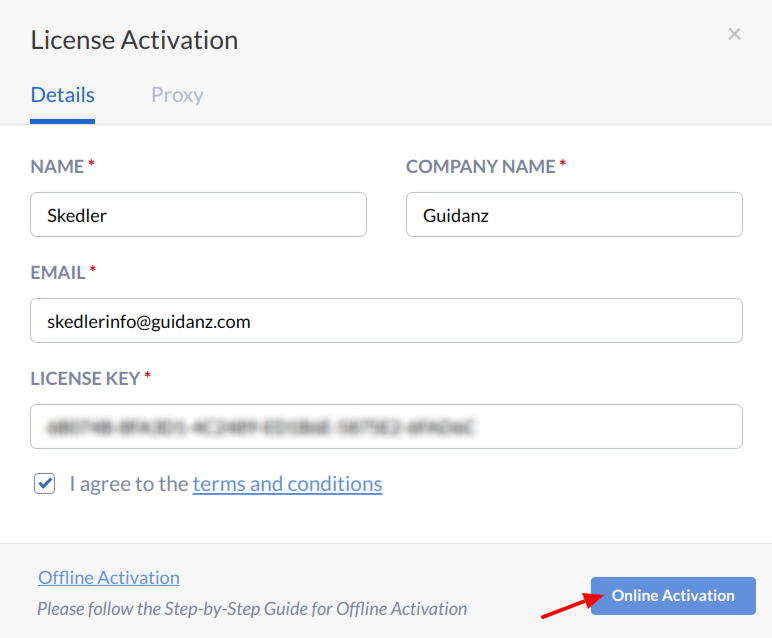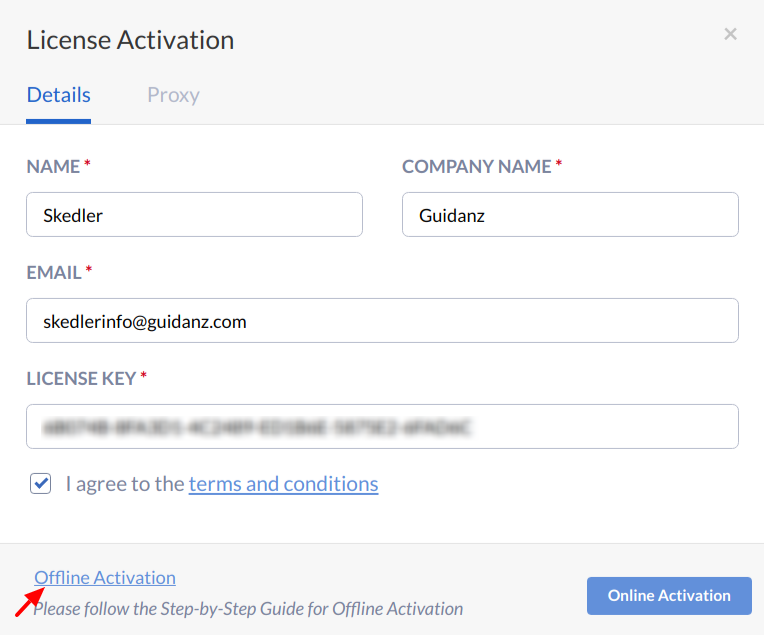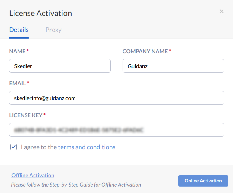 4. Enter the required values in the Name, Email, Company field and the product key in the License key field. Note: You must have a license key to activate the product. Activating the product offline does not require proxy settings.