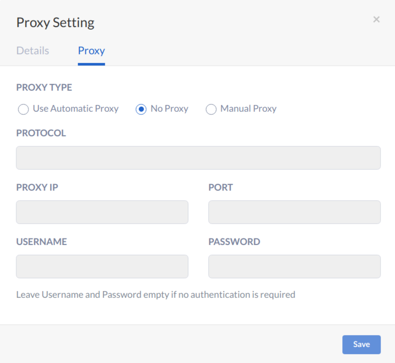 5. If the Internet connection requires a proxy server, click Proxy Setting in the License Activation page to enter the details. Specify the protocol, server name or proxy IP, and port. If the proxy setting requires user authentication, enter the username and password in the Username and Password fields. Click Save button. .The License Activation page is displayed.