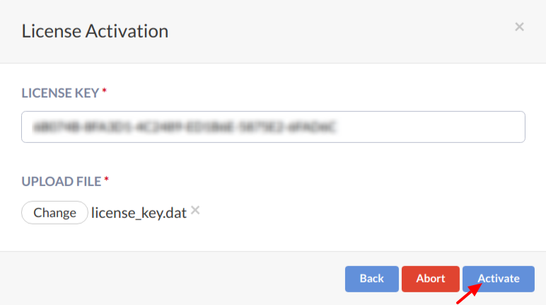 - Click Activate to activate the license. (If you would like to cancel the activation, click Abort).