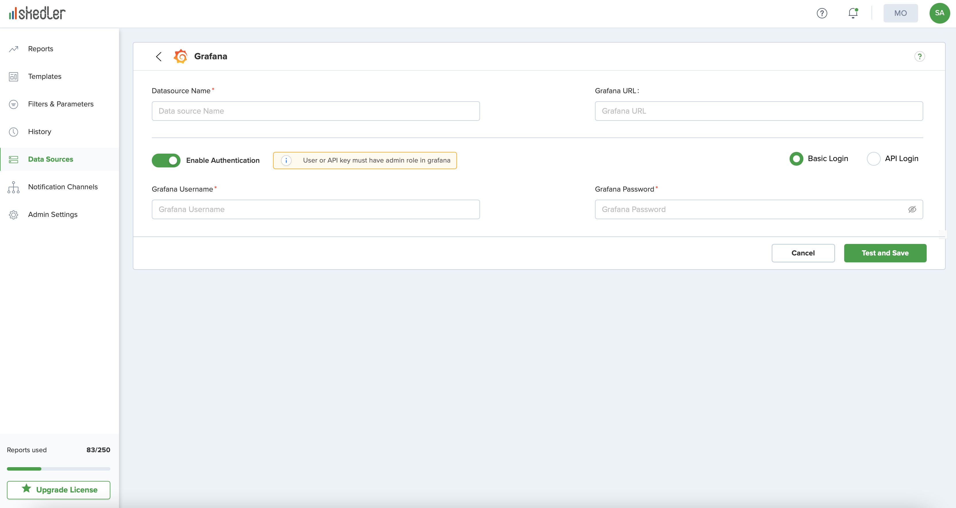 Fill in your Grafana URL and authentication data to connect Skedler to your Grafana. Click Test and Save.